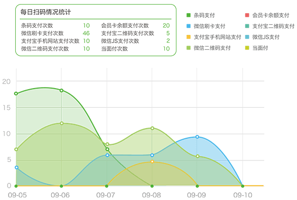 每个店铺往往有多个POS机,再加上微信支付宝收银,收银通道非常混乱。数度科技有全通道融合线上线下的收银体系,线上线下全通道财务数据统一